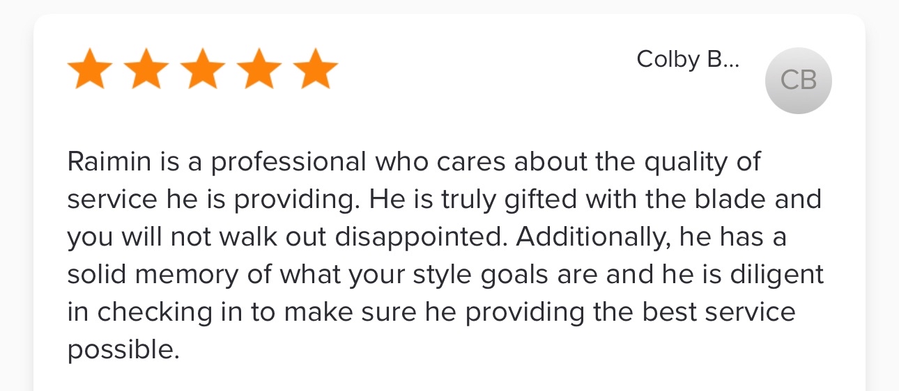 Simply confirm your appointment, and you’re all set! No wait times, no hassle—just show up, and Raimin will have you looking sharp in no time.